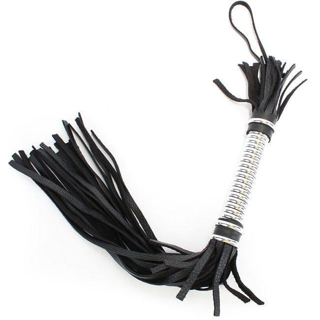 Черный флоггер из натуральной кожи с серебристой ручкой. Великолепный вариант для разогрева, а также в качестве элемента для эротических ролевых БДСМ-игр.