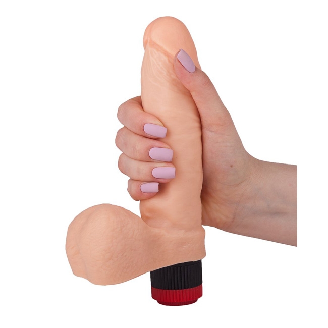 Небольшой реалистичный фаллос-вибратор с мошонкой и встроенным пультом управления.